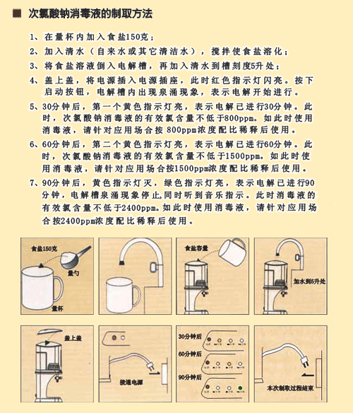 食盐+水,通电,OK!消毒液无毒,无害,没有残留物污染,不污染环境。